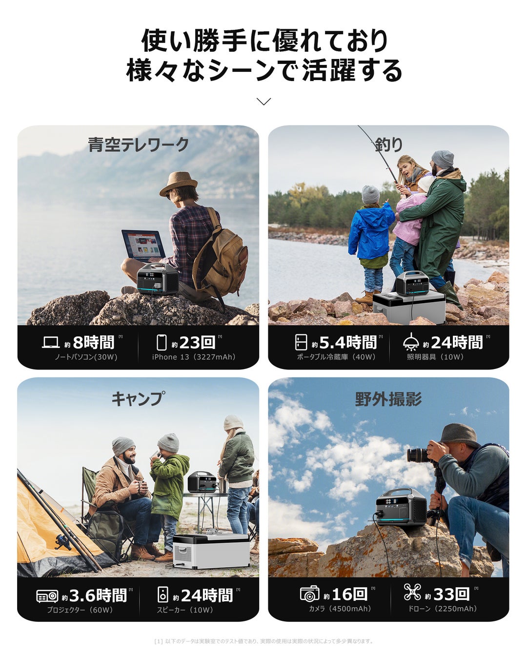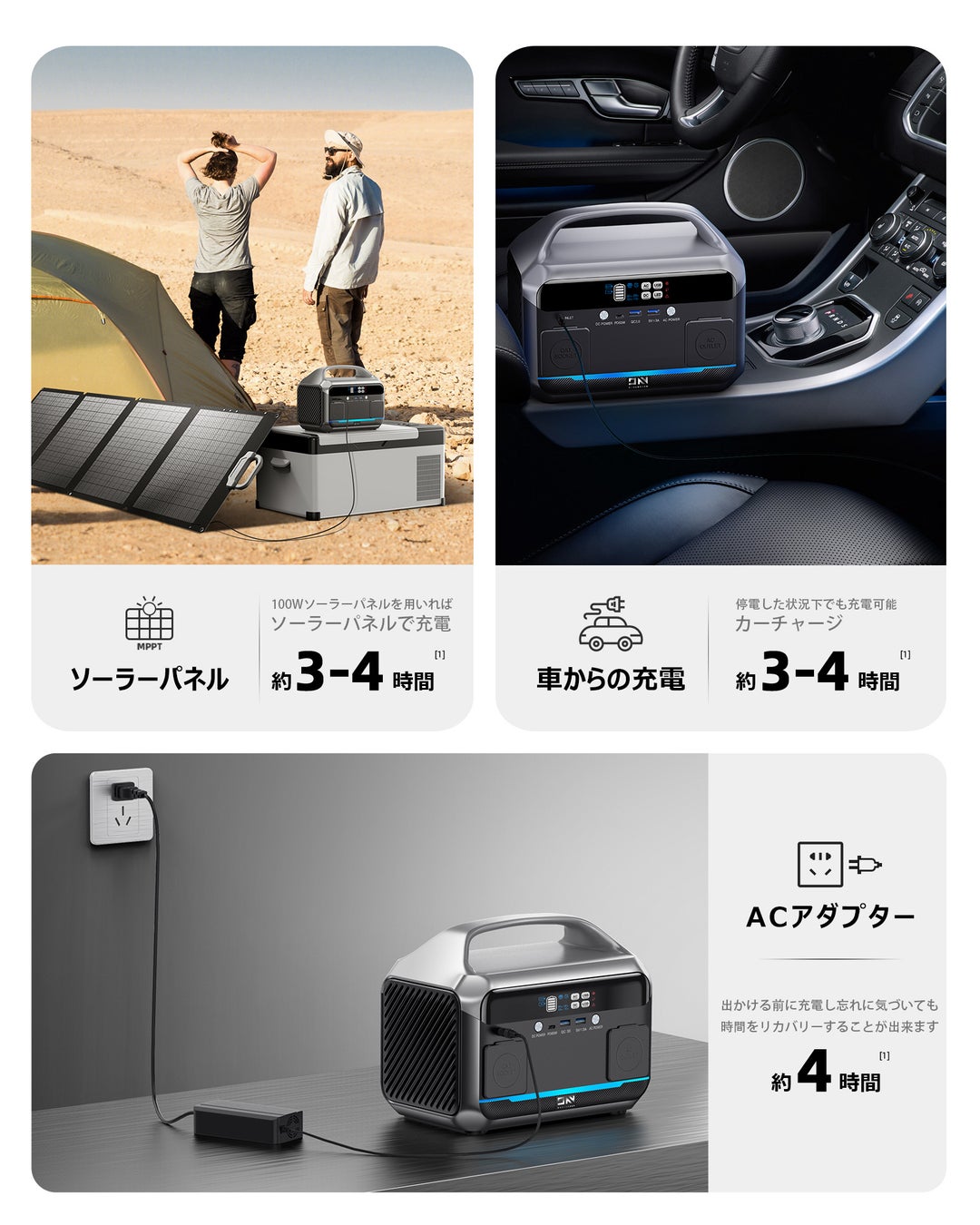 【豊富な充電方法】「ACコンセント」「ソーラーパネル」「シガーソケット」の他に「発電機」の合計4種類もの充電方法を可能にしました。家庭のACコンセントを使用すれば、わずか4時間でフル充電が完了します。ソーラー充電やシガープラグ充電にも対応しているので、非常用電源・防災グッズ・備蓄用の電源として、緊急時の様々な状況でも安心です。非常時だけでなく、普段にも使えます。太陽光や夜間の安い電気代の時(電気代が安くなる時間帯)にチャージして日中に使って電気代の節約に繋がります。さらに別売りのソーラーチャージャーを使うと、晴天下ならおよそ7時間でフル充電が可能です。