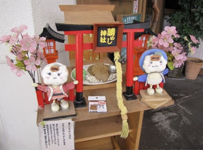 加古川市民の間では、大事な試合や試験などの前に「かつめし」を食べてから挑むという習慣があります。市内にあるかつめし専門店「いろはーず」の店前には、「勝めし神社」という小さな神社があり、試験や勝負ごとを控えた人たちが、「かつめし」を食べ、お参りしてから本番に臨むというゲン担ぎの場を提供するお店もあります。