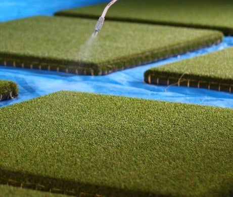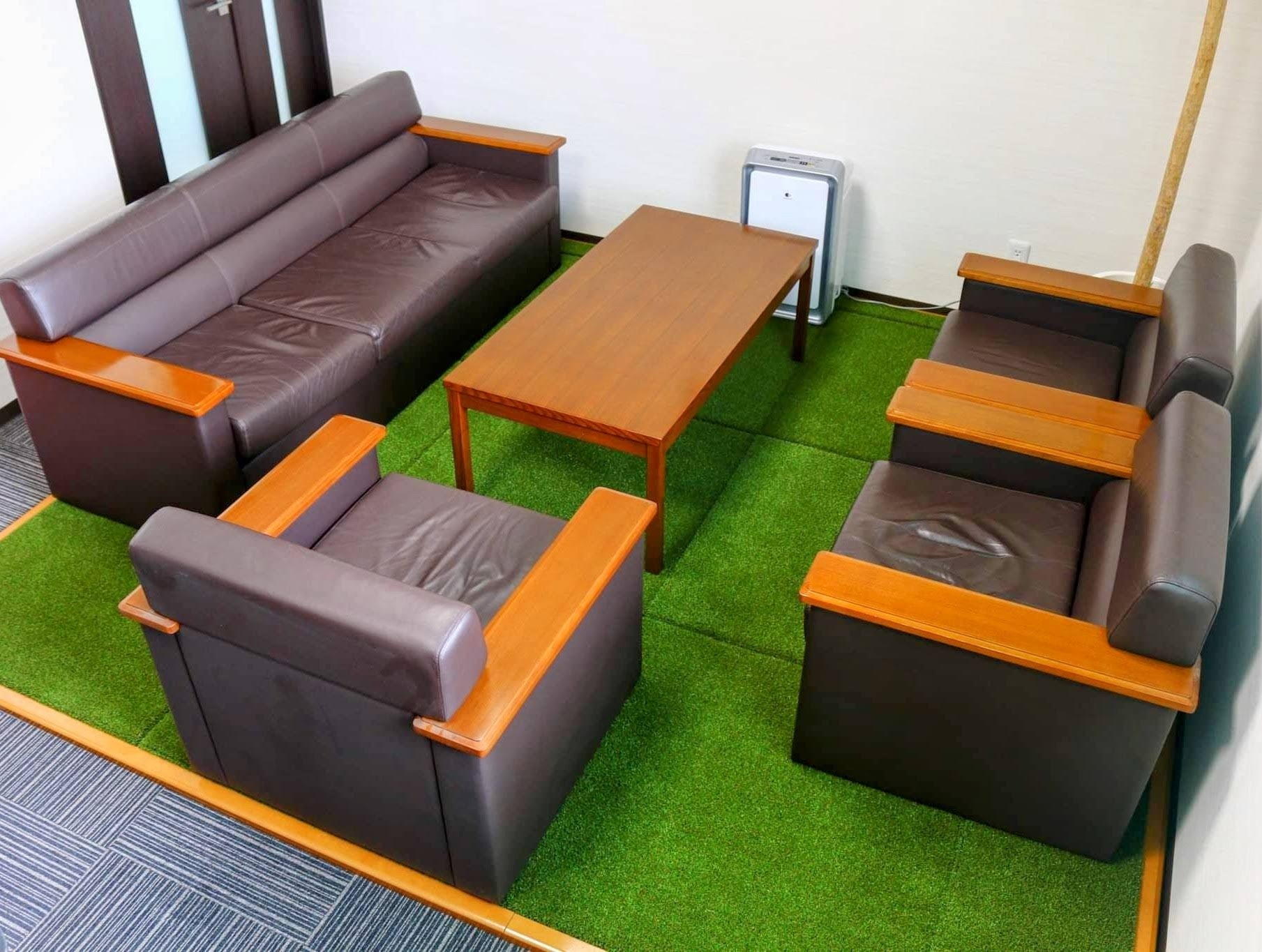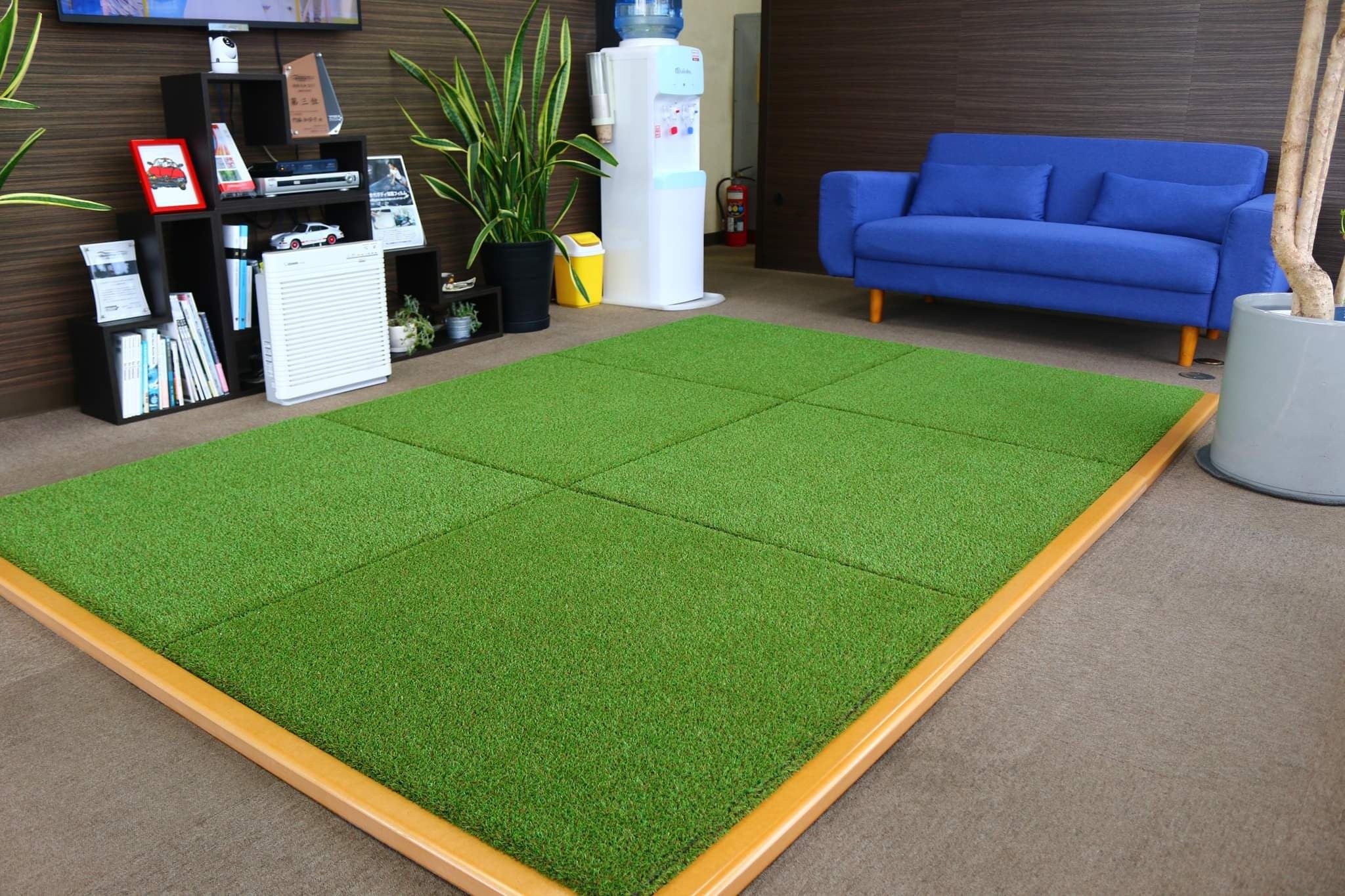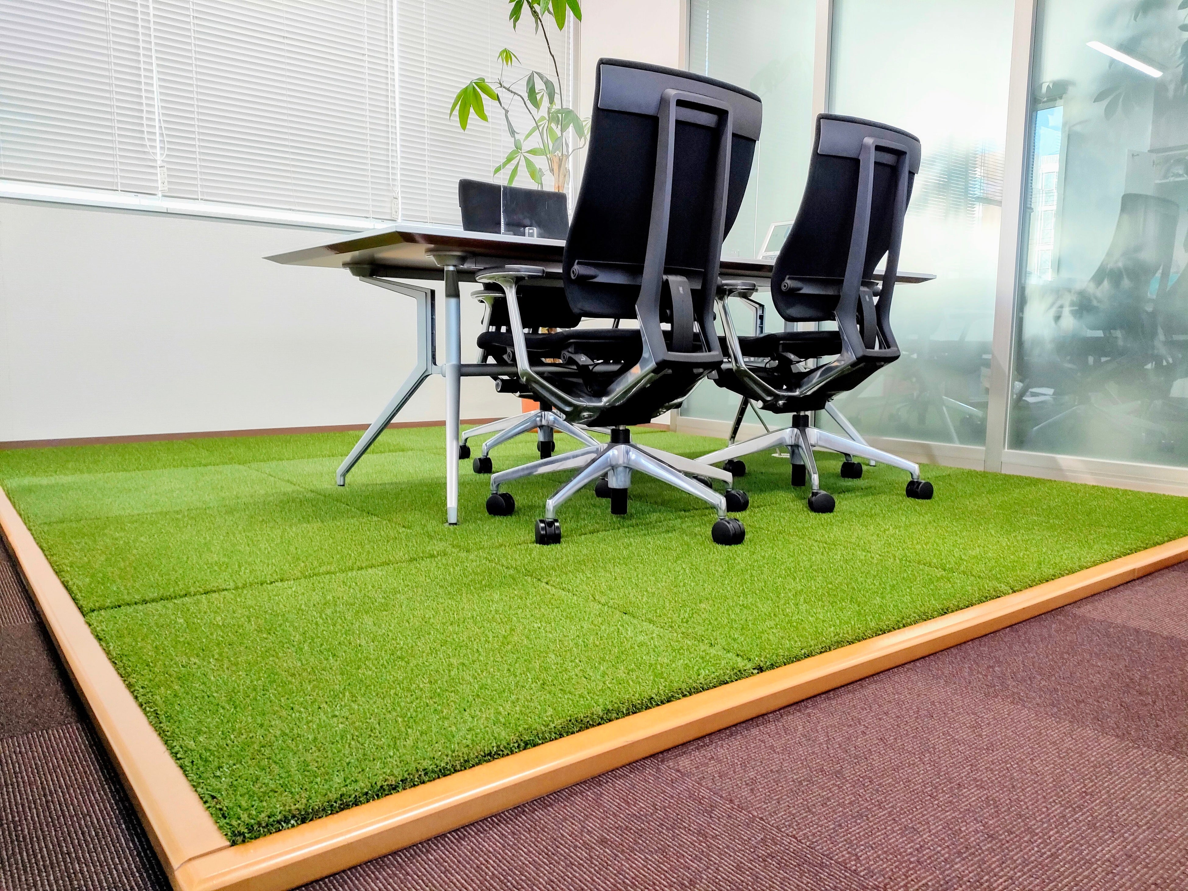 この商品はオフィス家具をそのままに、マットのように下に敷くだけで適度なクッション性と緑の開放感を実現することができます。そして、大切なゲストを足元からおもてなしすることができます。商品は半畳サイズの組み合わせで、2畳からの規格サイズの他、お部屋ごとに採寸してオーダーメイドで作ることができます。商品の厚みは、本格サイズの50ミリの他、段差を最小限にした27ミリもあります。