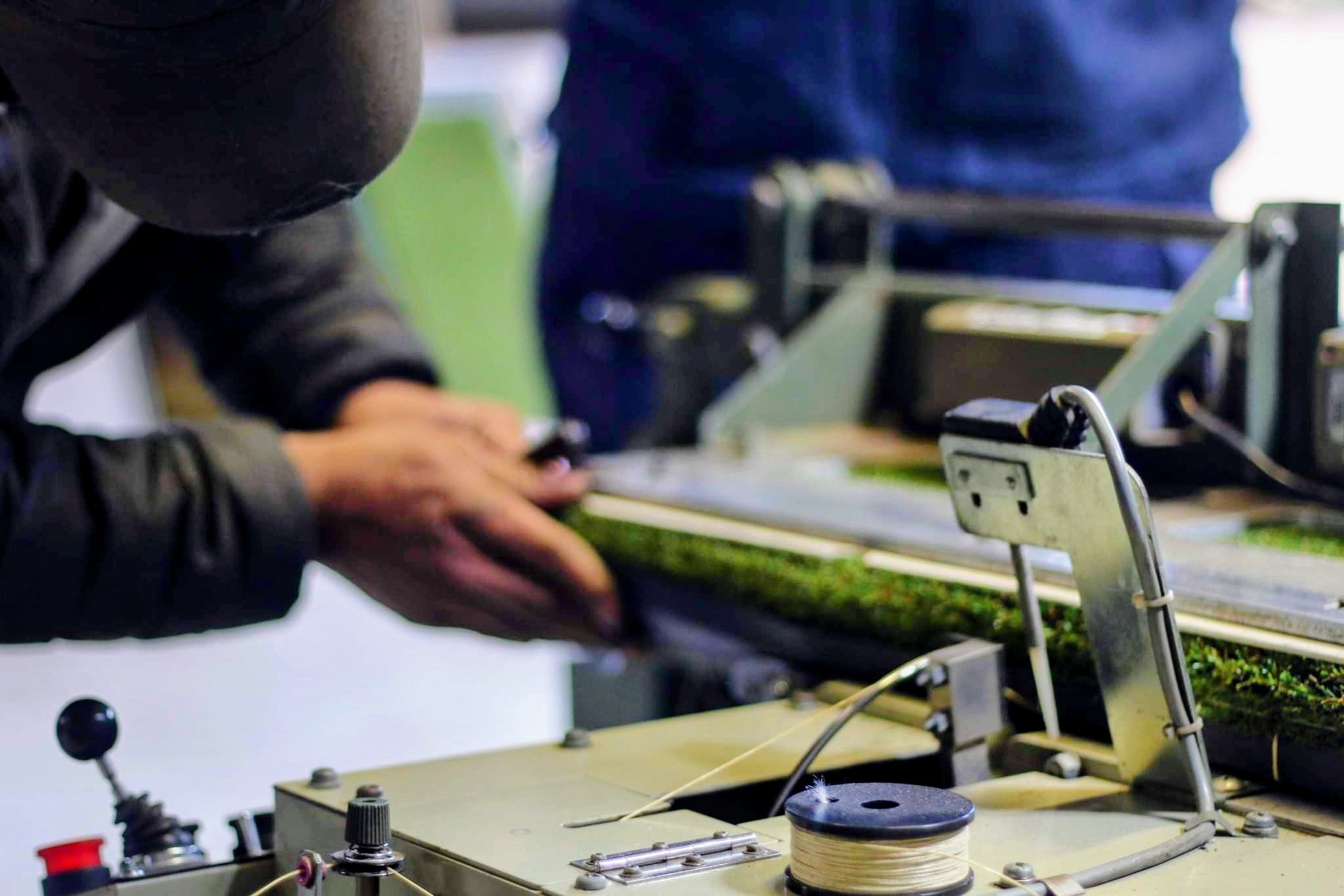 部屋芝は伝統技術「框縫い」を採⽤し、接着剤を一切使用せず、すべての層を強⼒な針と⽷で縫い合わせることで丈夫でズレない使い⼼地を実現しています。畳糸のみを使用しているため、アレルギーの心配もなく安心して使用できます。そして、天然芝の⾜あたりを叶えるこだわりの5段構造は、適度なクッション性を実現します。この5段構造により、断熱性を⾼め、暑い夏でも寒い冬でも居心地よく過ごせます。さらに、たたみ同等の消⾳性・防⾳効果もあるため下のフロアに音が響きません。