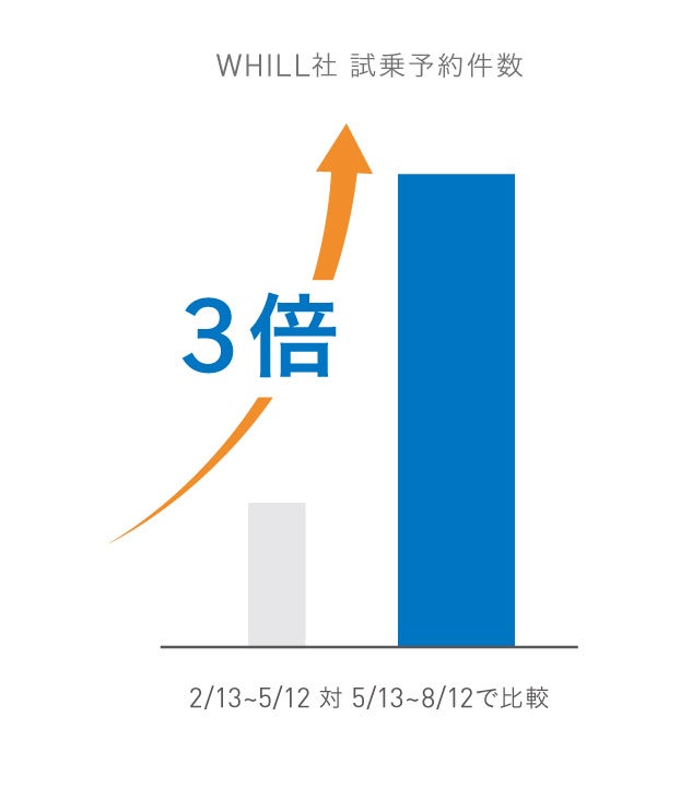 【右棒グラフ:WHILL社への試乗予約件数は、改正道交法を機に3倍に増加】