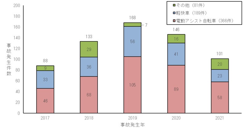 NITEに通知のあった製品事故情報※1では、2017年から2021年の5年間に電動アシスト自転車の事故が366件ありました。走行中に転倒した事故やバッテリーの焼損事故などが発生しています。