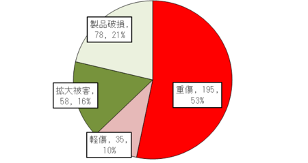 電動アシスト自転車の事故366件の「被害状況別の事故発生件数」を示します。自転車の製品事故は走行中に発生するものが多いため、重傷事故が半数以上と多く発生しています。