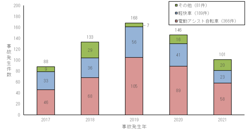 NITEに通知のあった製品事故情報※1では、2017年から2021年の5年間に電動アシスト自転車の事故が366件ありました。走行中に転倒した事故やバッテリーの焼損事故などが発生しています。