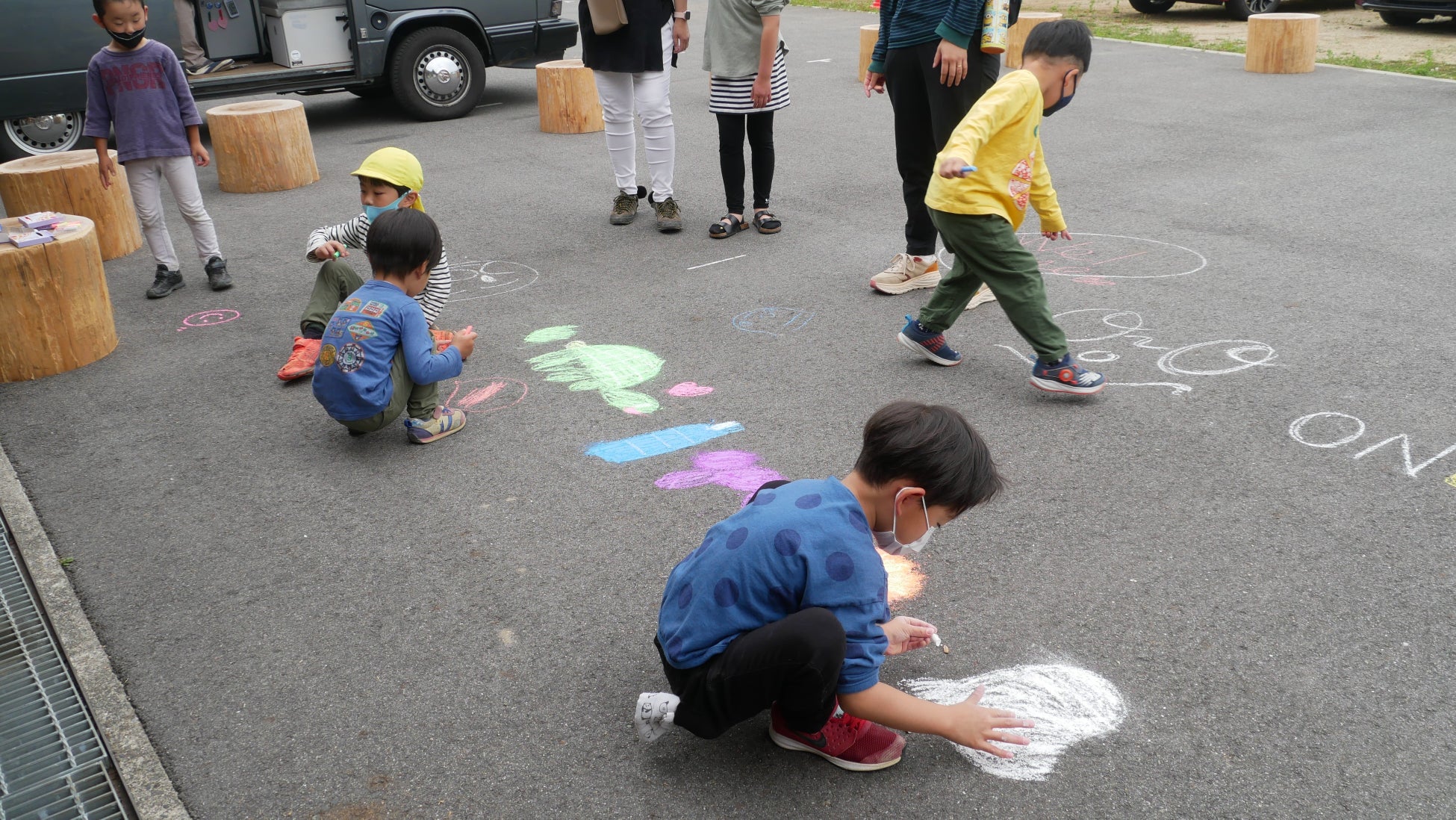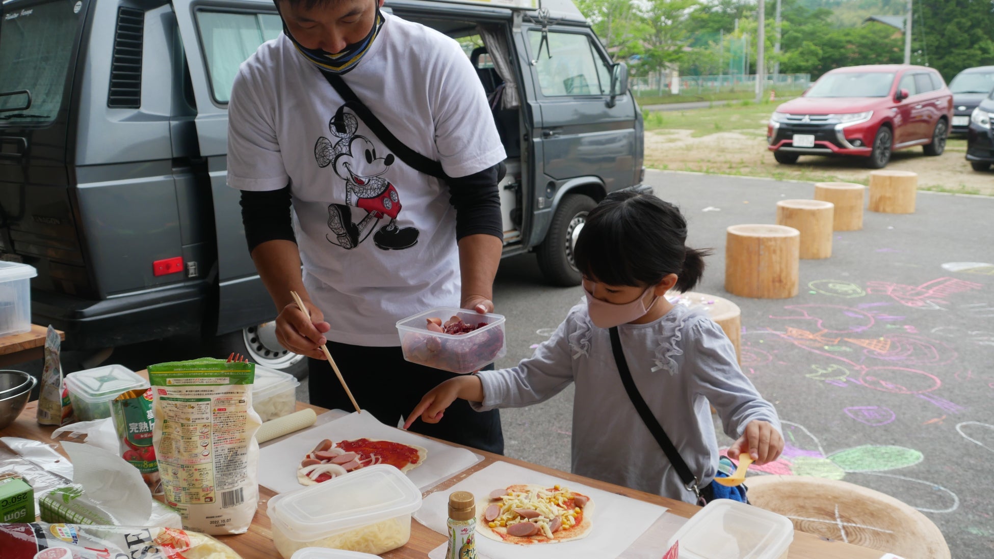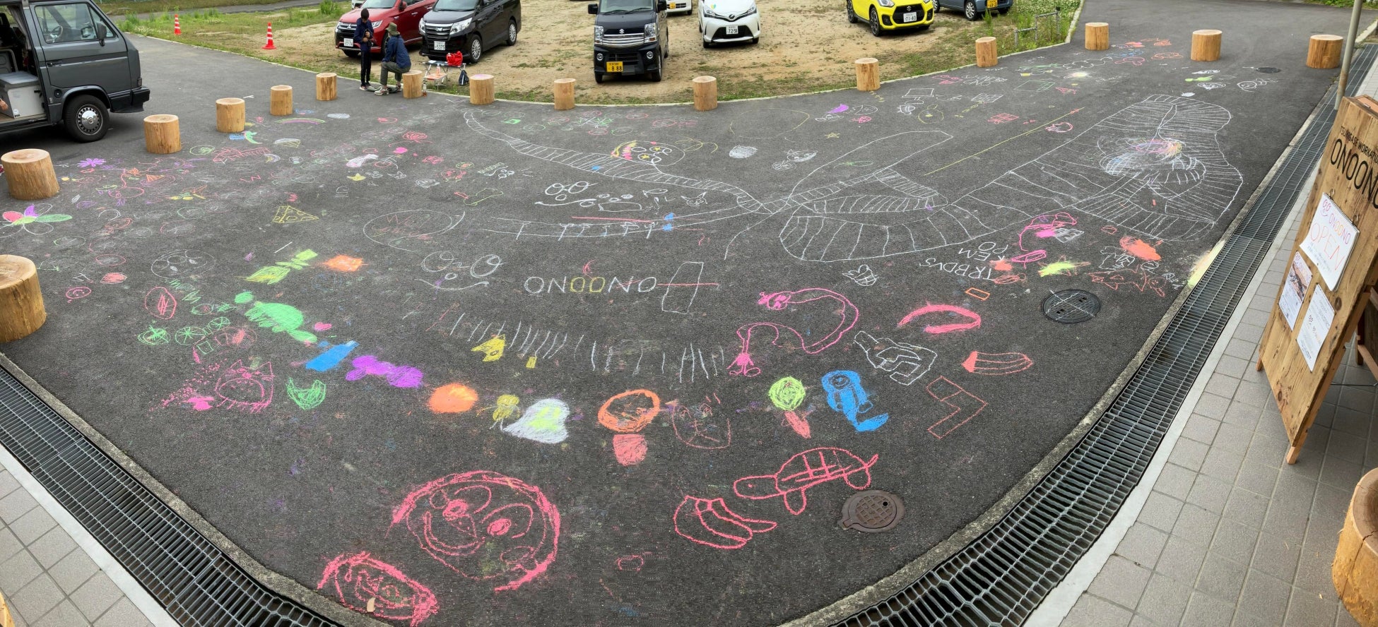 当日は、施設ロゴにONOONOの表情を描くワークショップ/道路でチョークお絵描き/生地から作る薪ストーブでONOONOのピザを焼こう体験/などを開催。月ヶ瀬住民に持ち寄っていただいた鹿肉やタケノコも集まった皆でいただき交流を楽しみました。