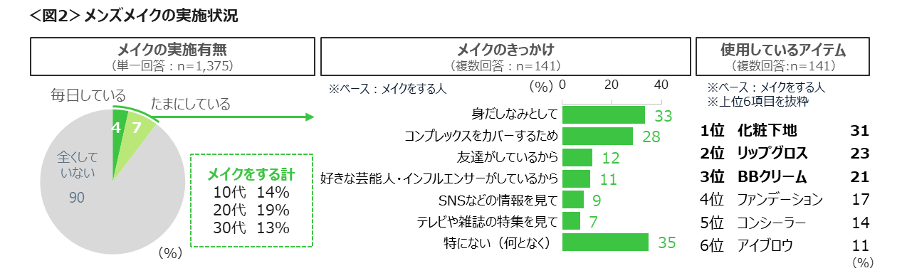 メンズメイク実施者は1割、最も実施率が高いのは20代の19%。メイク実施のきっかけは「特にない(なんとなく)」「身だしなみとして」「コンプレックスをカバーするため」が3割前後と多い。普段使用しているアイテムは「化粧下地」「リップグロス」「BBクリーム」など。<図2>