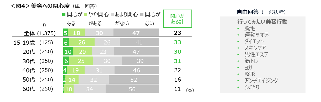 美容への関心度は、23%。15~19歳、20代、30代において関心度は3割を超える。今後行ってみたい美容行動は、「脱毛」「運動をする」「ダイエット」などの声があがった。<図4>