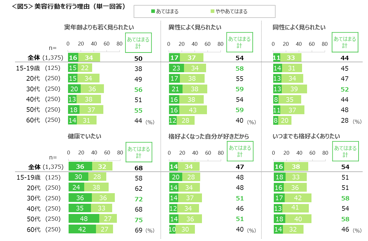 美容行動を行うのは「健康でいたい」「異性によく見られたい」「いつまでも格好よくありたい」という理由が多かった。「健康でいたい」は、30代以降の割合が高い。「実年齢より若く見られたい」と「異性によく見られたい」は、30代と50代で高い結果であった。<図5>