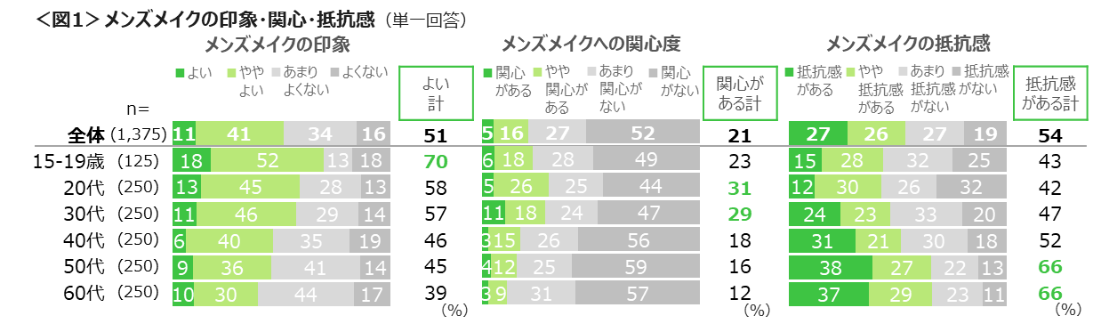 メンズメイクをしている人に対しての印象は、「よい+ややよい」と思う人が51%、15~19歳は最も高く7割を占めた。関心度は21%であり、20代、30代は3割前後と高め。自身がメイクをすることに対し、「抵抗感がある」は54%、50代、60代の抵抗感は強い。<図1>
