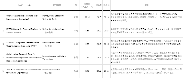 下の表は、多額の研究資金を獲得したプロジェクト(グラント)5件です。第5位のSPICEプロジェクトは2010年に開始された、成層圏への粒子注入による気候変動の緩和に特化したプロジェクトです。英国はこの時点で、成層圏への粒子注入に約250万ドルの研究費用を投じることを決断していました。