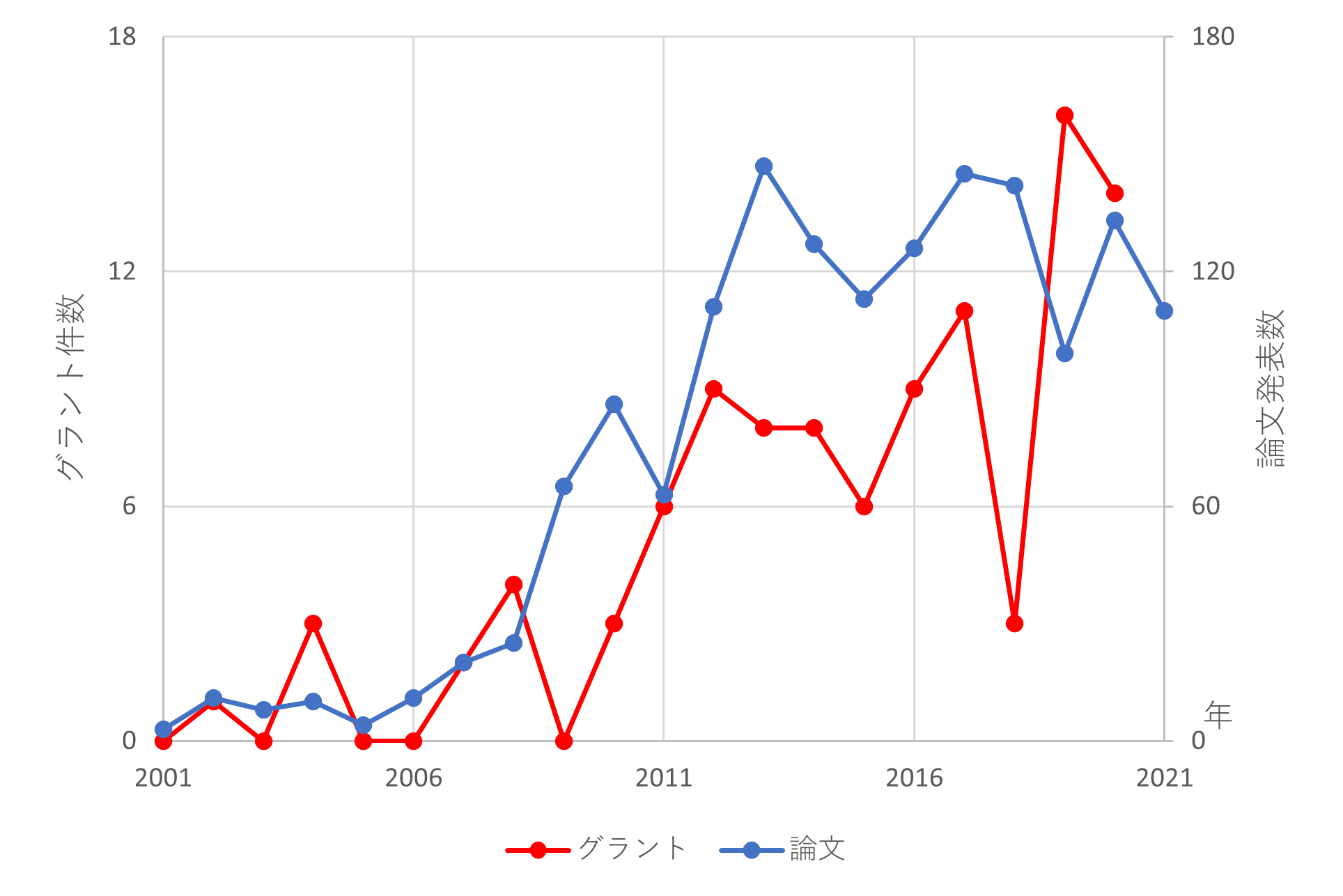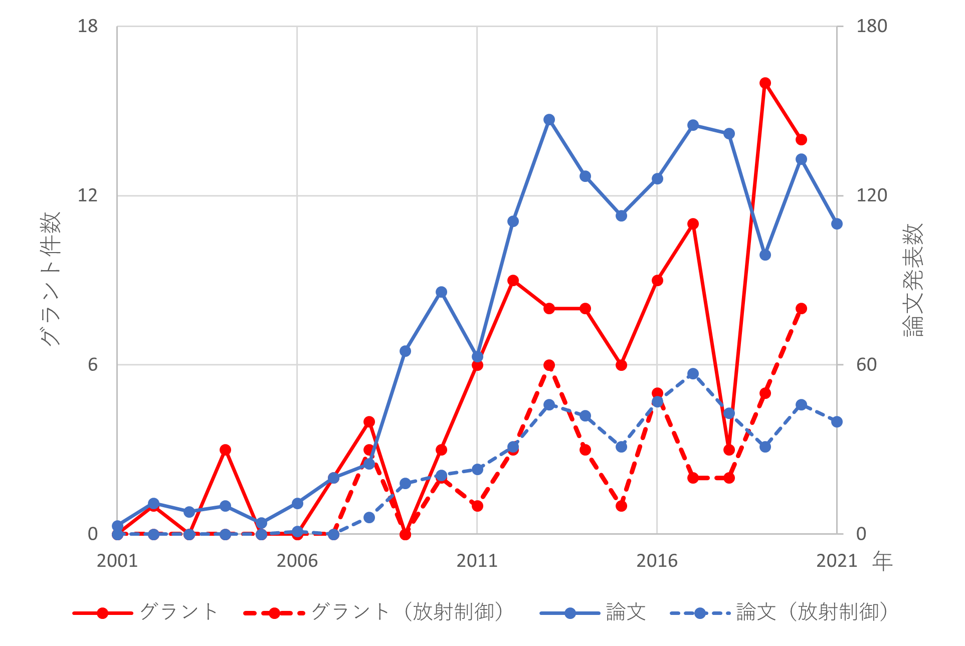 図2:放射制御に関連するプロジェクト(グラント)数/論文発表数と全グラント・論文の推移。左右の縦軸の対応は図1に同じ。
