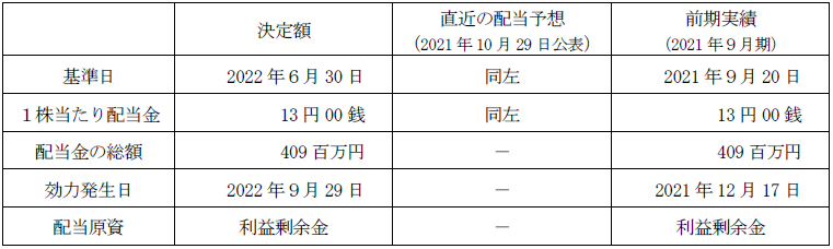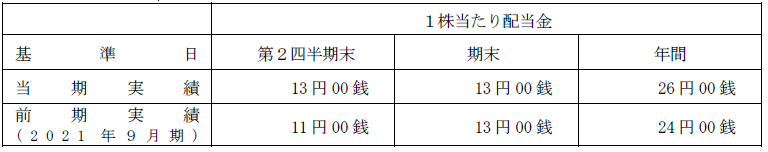 以上により、直近の業績動向を含め総合的に検討した結果、2022年6月期の期末配当金につきましては1株当たり13円00銭とすることといたしました。これにより、当期の年間配当につきましては、前期から2円増配した1株当たり26円となります。