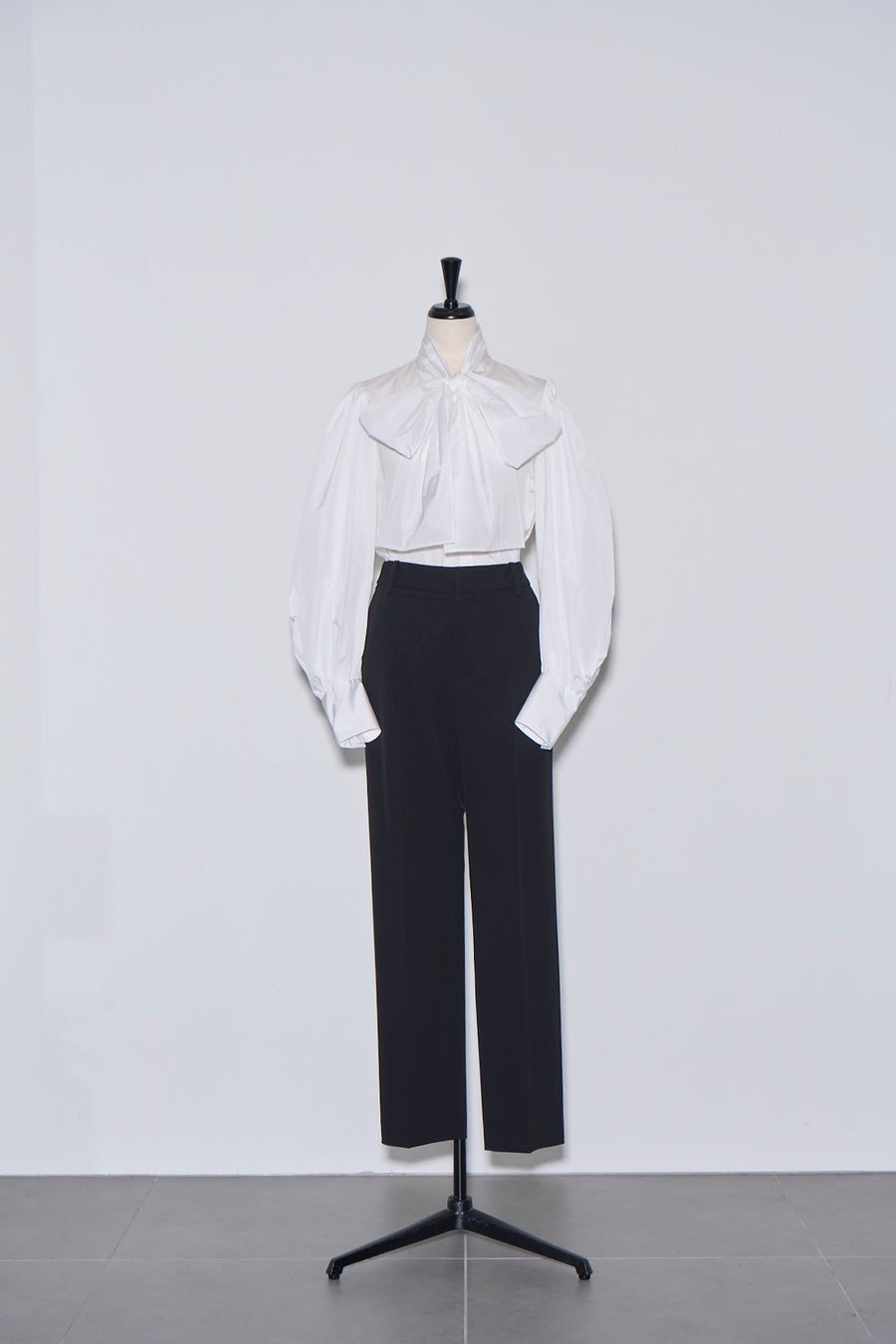 イタリアの伝統であるシルクの技術を継承し、現在のニーズに応じて進化し続けるファブリックメーカー「ETIQUE」社の「シルクタフタ」を使った、ラグジュアリーなブラウス。高密度に織り上げたハイグレードなこの生地は、海外のトップメゾンにも愛され続けている特別なマテリアル。横糸にシルクを使用することにより生まれるエレガントな艶が、華やかなブラウスに深みのある光沢を生み出します。