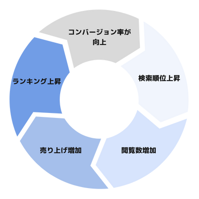 これがしっかりできている商品ページは、下記のようなAmazon特有の売れるサイクルに突入することができ、ライバル商品との価格競争に巻き込まれることなく売り上げを伸ばしていくことができます。