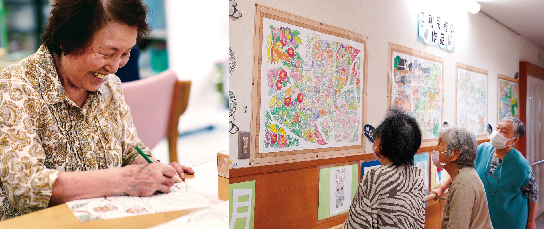 「まるレク便」はレクリエーション素材の定期便サービスです。2021年11月より販売しているレク素材「ピースぬりえ」はA1サイズの巨大なぬりえを9つのピースに分割したものです。複数人で1つの作品を仕上げますが、1ピースごとに分割されているため、ソーシャルディスタンスを保ちながら、コロナ禍でもコミュニケーションを生み出すことができるレク素材です。これまでに約20施設へ提供し、介護従事者からは「レクリエーションを実施する負担が減った」「活動中の会話が生まれやすい」、施設利用者からは「通う楽しみにつながる」などの反響がありました。