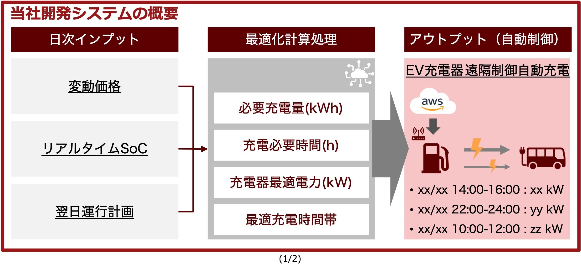 今般の本実証を通じて、車両のSoC(State of charge)や契約電力に応じ、また公共交通機関であるEVバスの運行スケジュールを前提とした充電タイミングや充電出力を自動で調整できる仕組みを構築することで、EVバスの導入推進に取組んでまいります。