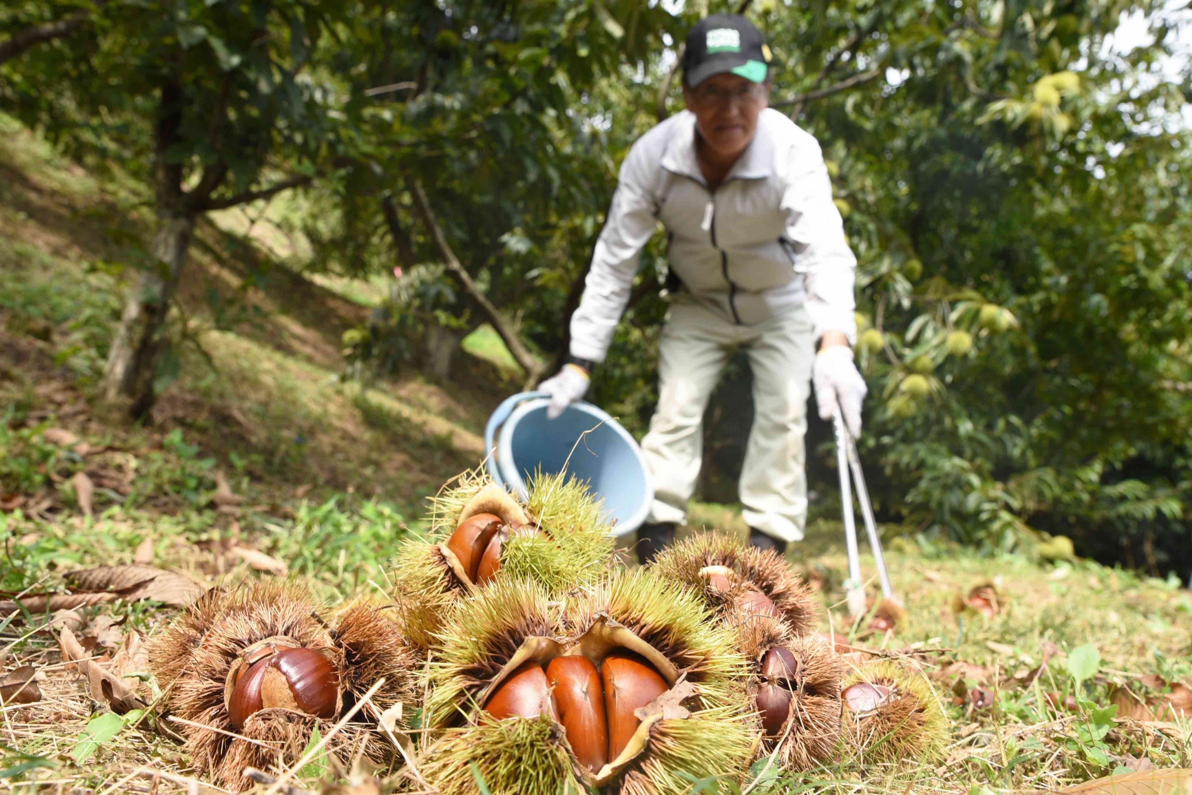 生産農家の大向善信さん(おおむかい よしのぶ)が栽培する主な品種は、「銀寄」「筑波(つくば)」「有磨(ありま)」「ポロタン」「丹沢」の5種類。年間の生産量は約1200kgでその約6割を銀寄で占める。大向さんが家族3人とアルバイト2人で作業を行う自宅から少し離れた圃場では約250本の栗の木を栽培。栽培面積は80アールほどで、例年9月上旬から10月上旬にかけて収穫している。大向さんは「今年は夏に雨が多かったおかげで、例年より全体的に大ぶりです。温度の寒暖差が出てきたので甘く上質のものを味わってもらえると思います。」などと話していた。