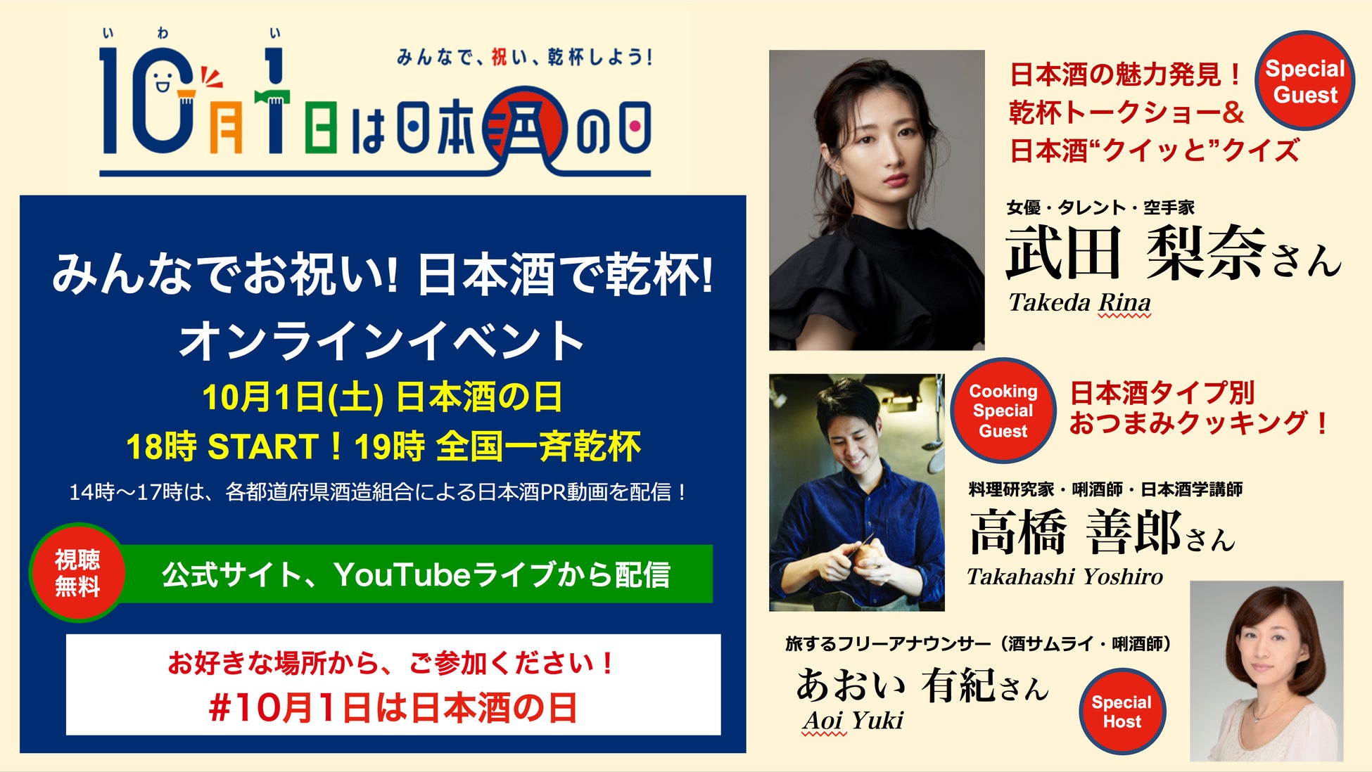内容:どなたでもお店で、お家で自由にご参加いただける「日本酒で乾杯!」オンラインイベント(YouTube LIVE)。全国各地のイベント会場や海外を結んでの中継や、19時にはオンラインで全国一斉「日本酒で乾杯!」を行います。イベントではスペシャルゲストとして女優の武田梨奈さんによる乾杯トークショー・クイズや料理研究家・高橋善郎さんによる日本酒に合うおつまみレシピの実演も開催します。