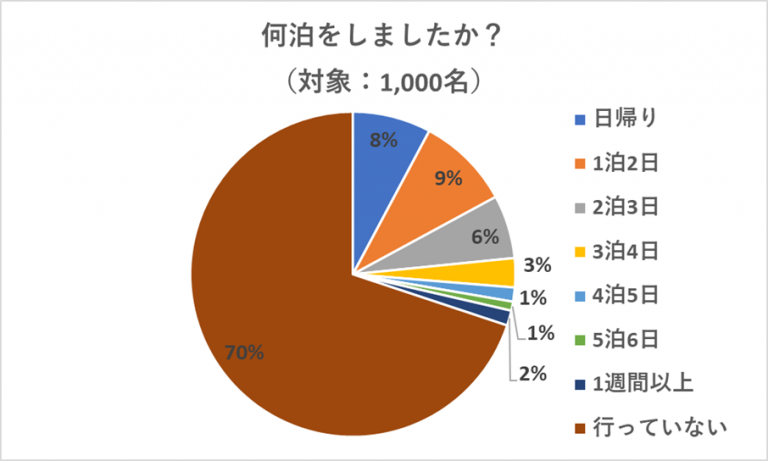 宿泊した日数については、「1泊2日」という回答が9%、次いで「日帰り」という回答が8%、「2泊3日」という回答が6%という結果になりました。あまり長期滞在するというよりは短い日数で旅行を楽しんでいる人が多いようですね。