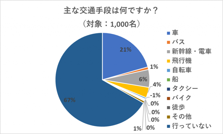 主な交通手段については、「車」と答えた人が21%と最多でした。コロナ禍の影響もあり、他の人との接触が少ない移動手段を選んでいる人も多いのかもしれませんね。