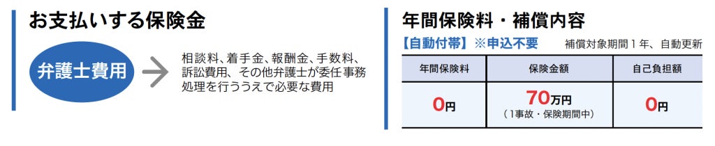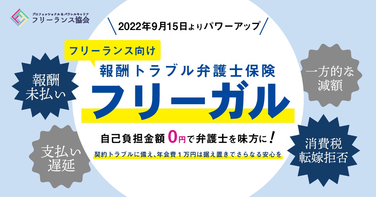 自己負担額が気になって、せっかくのフリーガルを利用できないということがなくなり、より多くのフリーランスが安心して自身の仕事に集中できるようになることを願っております。(保険金額はこれまでと変わらず、1事故・保険期間中70万円です)