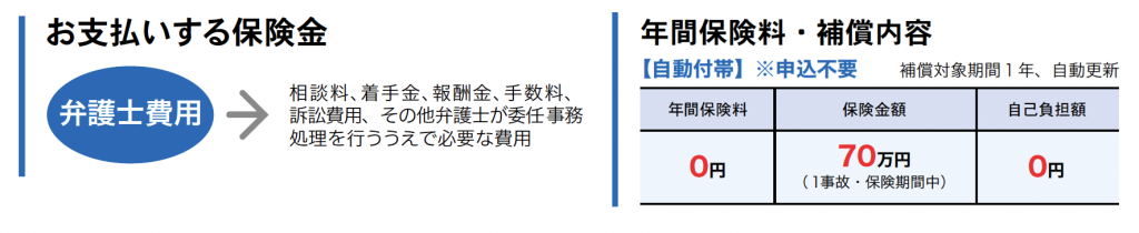 昨年9月にフリーガルが自動付帯になってからは、保険料支払い負担は無い一方で、保険利用時(弁護士利用時)は請求金額の40%を自身でご負担いただく免責がありました。