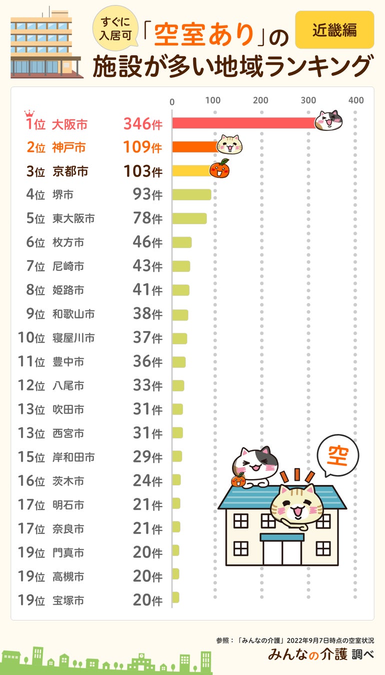 2022年9月7日時点で、近畿圏に所在する「空室あり」の老人ホームが多い地域をランキング形式にまとめました。
