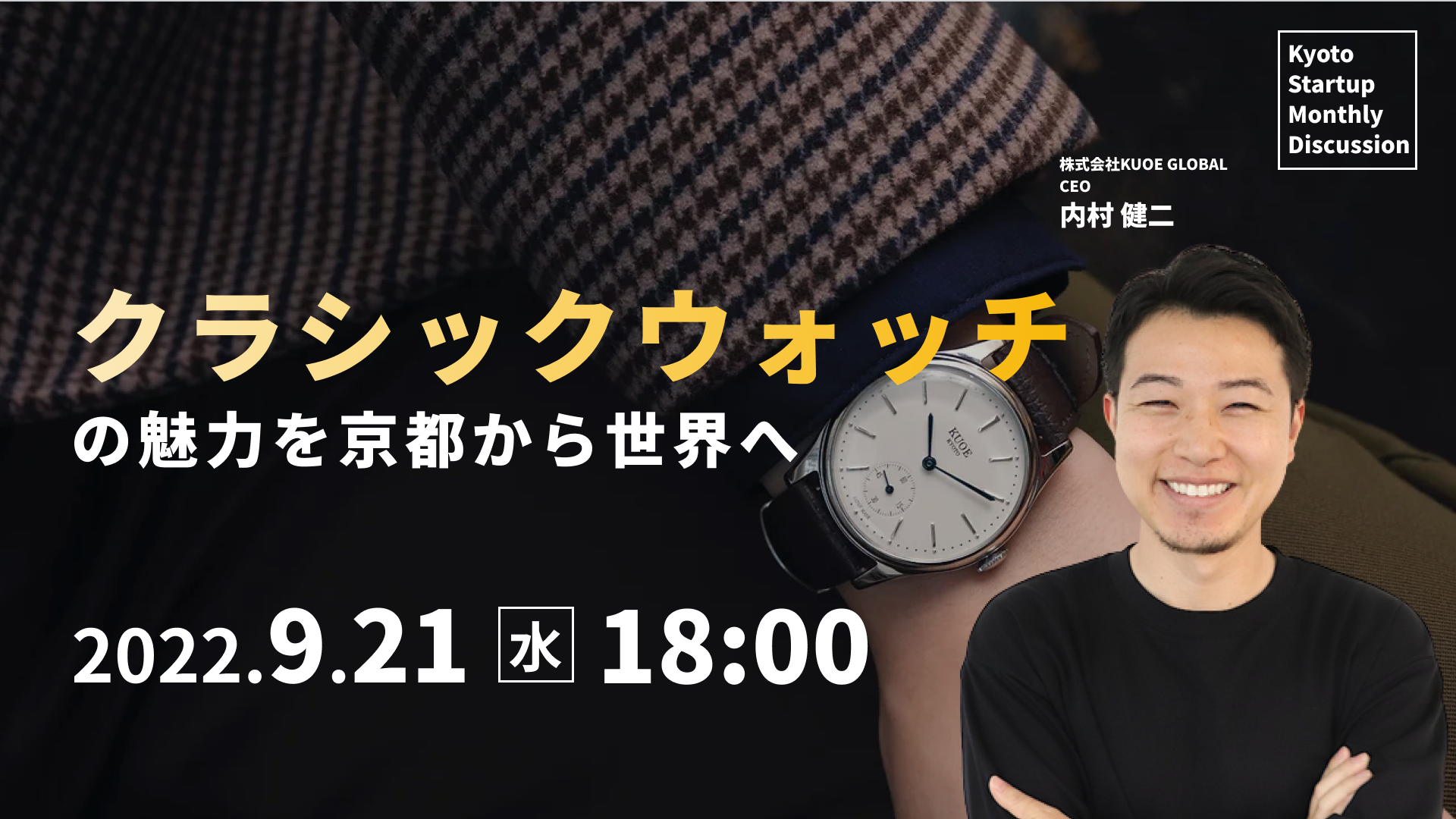9月のMonthly Discussion#16は、「クラシックウォッチの魅力を京都から世界へ」をテーマに、京都発のクラシックウォッチブランドとして、日本製の高品質なアンティークデザインウォッチの素晴らしさを世界中の人に発信されている「株式会社KUOE GLOBAL」 代表取締役 内村 健二さんにご登壇いただき、起業の経過や起業前後における様々な課題の克服、京都を拠点にスタートアップをする理由などをお伺いします。