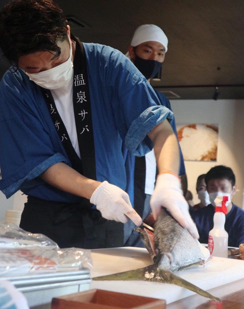 白寿の湯の料理長が旬の魚を日本全国の市場から取り寄せ、お客さまの目の前でさばき、振舞うイベント。毎月第三日曜日に開催します。白寿の湯は敷地内でサバの陸上養殖に挑戦しており、イベントを通じて、地方の珍しい魚種の紹介や、地域ならではの食べ方など、各地の食文化の発信を行っていきます。