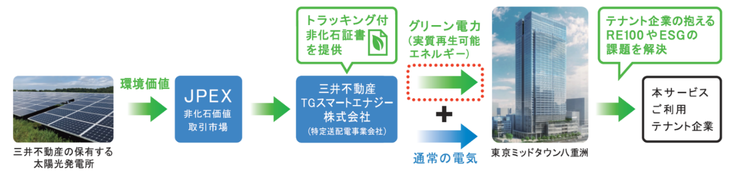 東京ミッドタウン八重洲では、使用電力をグリーン化する「グリーン電力提供サービス」を導入します。本サービスをご利用される企業の使用電力は、国際基準であるRE100に適合した電気として認定されます。また、施設内の使用電力に、当社が保有する全国5か所の太陽光発電所の環境価値を付加する初の事例となります。