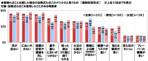 また、紙巻たばこと比較した場合の加熱式たばこのメリットだと思うものを聞いたところ、「灰が出ない」(54.2%)が最も高くなり、「においが少ない」(53.9%)、「部屋の空気や壁紙を汚しにくい」(52.9%)が続いた。紙巻たばこと比べて周囲へ配慮できる点をメリットに感じている人が多いのではないだろうか。