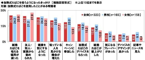 - 加熱式たばこを吸うようになったきっかけ TOP2は「紙巻たばこを吸える場所が減った」「友人・知人・家族から勧められた」