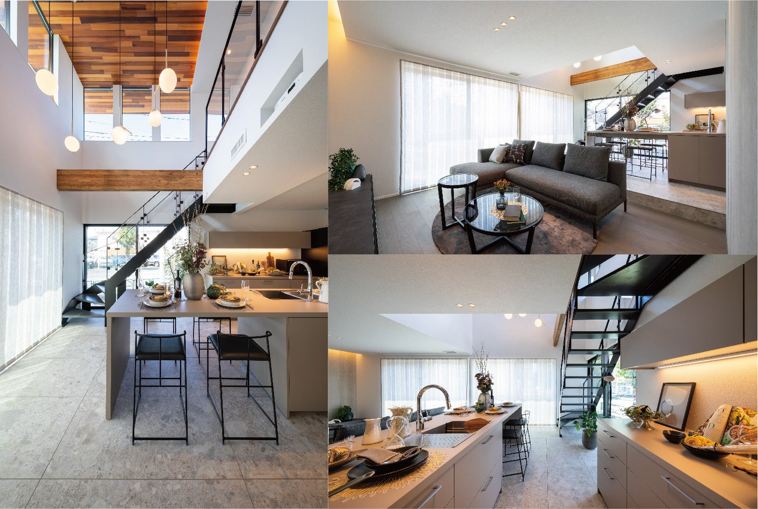 内観は、白・グレー・木目を基調としたカラーコーディネートで、まるでホテルにいるような洗練さと心地よさを兼ね備えたインテリアで構成しております。ウッドデッキにつながる大きな窓やDK空間の上部の吹抜から、明るく開放的な居住空間を演出しております。