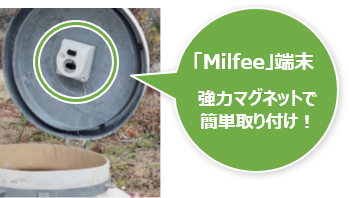 「Milfee」端末を既存の飼料タンクに後付けすることで、タンク内の残量を計測して遠隔で一括管理ができます。工事不要でマグネットでポン!と、とりつけることができるたった5分の簡単設置。農家様ご自身でも容易にとりつけ可能です。