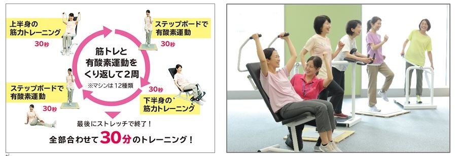 女性だけの30分フィットネス「カーブス」で行っているサーキットトレーニングを週3回のペースで実施いただく予定です。筋力トレーニング(12種類)と有酸素運動を30秒ずつ交互に行いながらサーキットを2周し最後にストレッチで終了するもので、1回30分で健康づくりに必要なすべてのトレーニングが行えます。カーブスで行っているサーキットトレーニングは東北大学加齢医学研究所 川島隆太研究室との共同研究で認知機能の改善に効果があると実証されています。