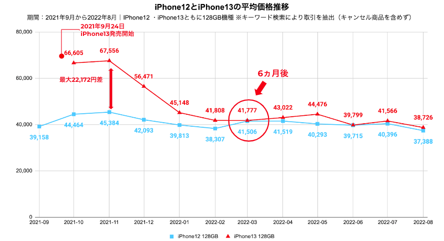 このような状況に合わせ、この度、「メルカリ」におけるiPhone12およびiPhone13の平均価格推移を調べました。過去の傾向をみると、中古品を前提に最新シリーズへの買い替えを検討する場合、発売から約6か月後から旧シリーズとの平均価格差がなくなり、約5,000円(※3)程度で買い替えが可能になることがわかりました。
