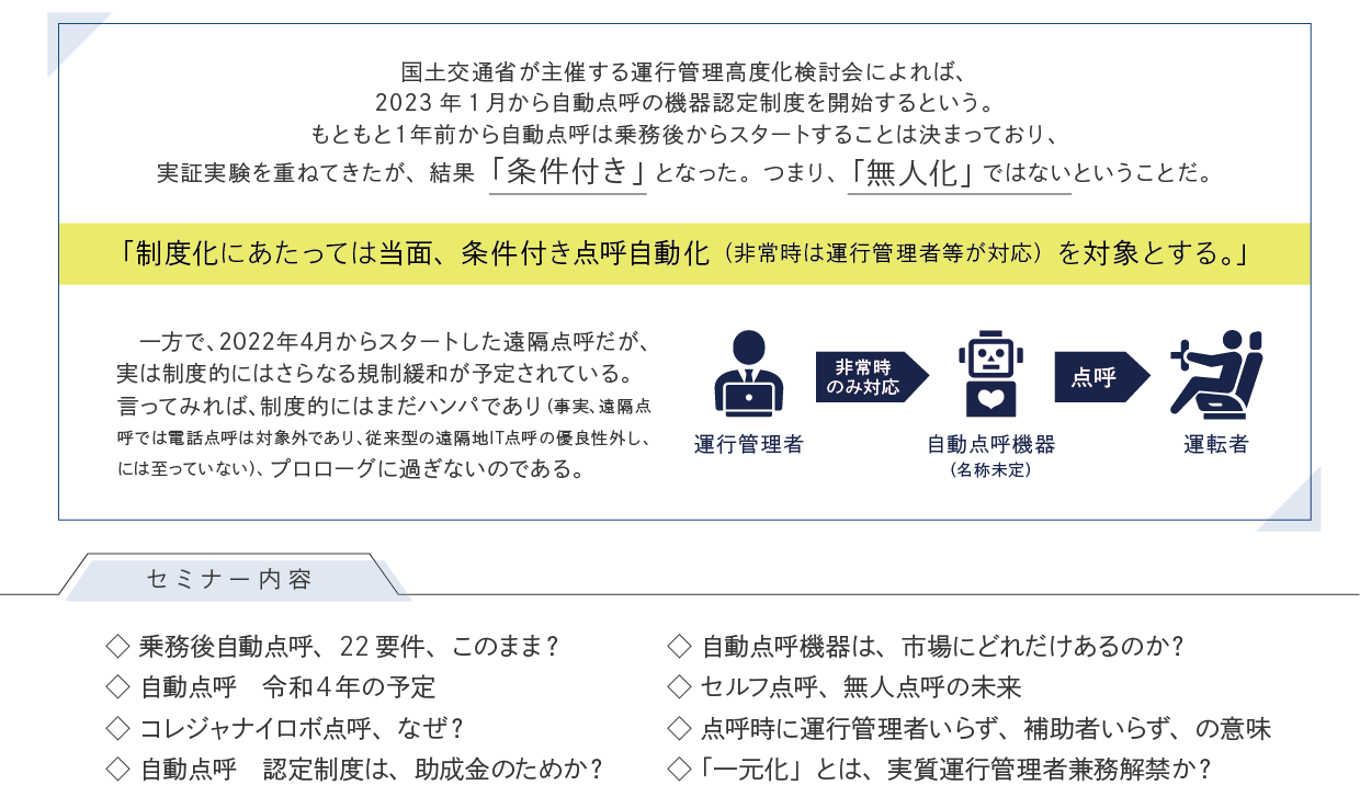 言ってみれば、制度的にはまだハンパであり(事実、遠隔点呼では電話点呼は対象外であり、従来型の遠隔地IT点呼の優良性外し、には至っていない)、プロローグに過ぎないのです。
