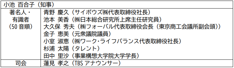 (敬称略、50音順)青野 慶久(サイボウズ株式会社代表取締役社長)/池本 美香(株式会社日本総合研究所上席主任研究員)/大久保 秀夫(株式会社フォーバル代表取締役会長(東京商工会議所副会頭))/金子 恵美(元衆議院議員)/小室 淑恵(株式会社ワーク・ライフバランス代表取締役社長)/杉浦 太陽(タレント)/田中 里沙(事業構想大学院大学学長)