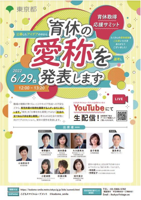 その取組の一環として、「育休」を「仕事を休む期間」ではなく「社会の宝である子供を育む期間」と考える社会のマインドチェンジに向けて、育児休業の愛称を募集していたところです。このたび、以下のとおり、「育休取得応援サミット」を開催し、育児休業の愛称を発表しますので、お知らせします。