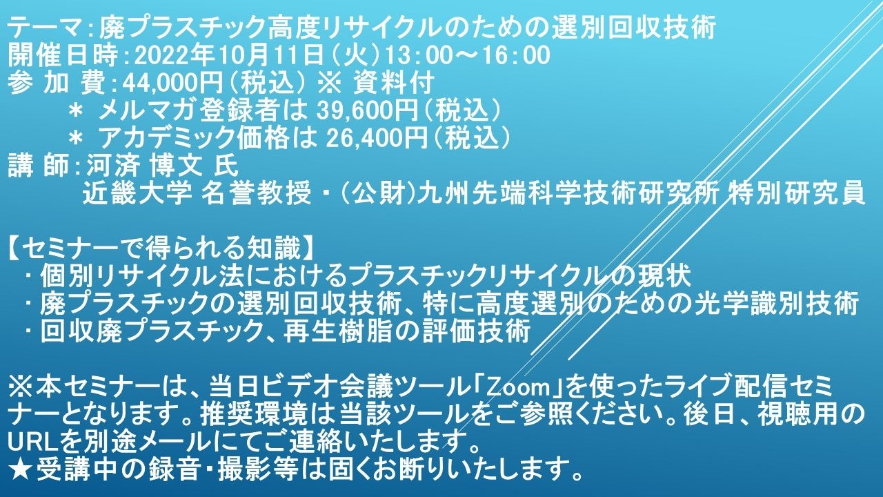本セミナーでは、高純度に回収するには必須ともいえるプラスチックの光学識別技術を中心に、周辺技術も含めた選別回収方法を、技術の原理的な面も含めて解説します。また、廃家電や使用済自動車での大量処理の具体例、現状のリサイクル技術での課題と最新動向も紹介します。