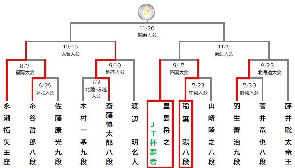 その10局の戦型は、角換わり腰掛け銀が3局、横歩取りが2局、後手雁木が2局、角換わり早繰り銀が2局、相掛かりが1局といずれも相居飛車の戦いとなっている。今回も当然この中からの選択ということになるだろう。奇しくも両者ともNHK杯将棋トーナメント、銀河戦での優勝実績がある。すなわち時間の短い棋戦に強いという証しだが、この「JT杯」での対戦は今回が初めてとなる。年齢も2歳差と近く、同じ関西所属で、お互い手のうちもわかっている者同士の対戦。展開としては、豊島JT杯覇者が序盤から仕掛けて先攻を目指し、それに対し稲葉八段がどう対応していくのかということになりそうだが、最近の二人の対戦を見ると手数が長い。激戦そして大熱戦になることが予想される注目の一戦である。