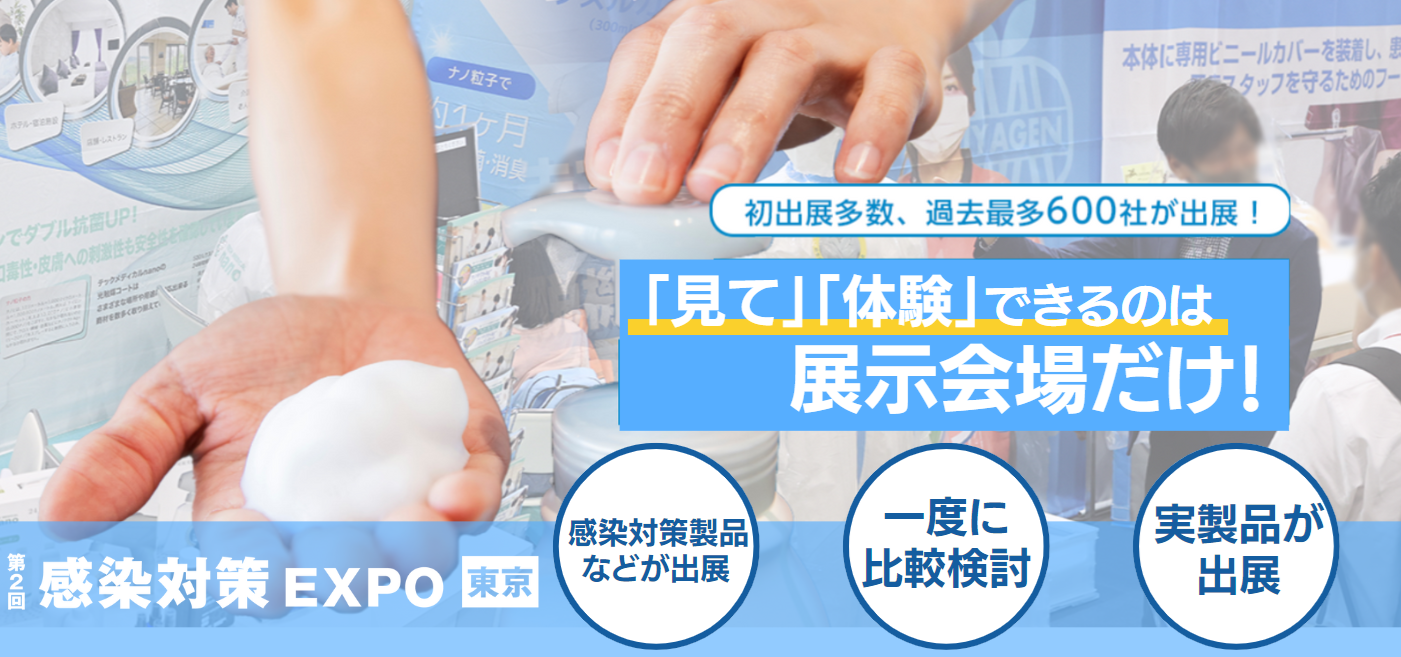 感染対策EXPOは、消毒剤・飛沫防止製品・衛生用品などの感染対策製品が展示される展示