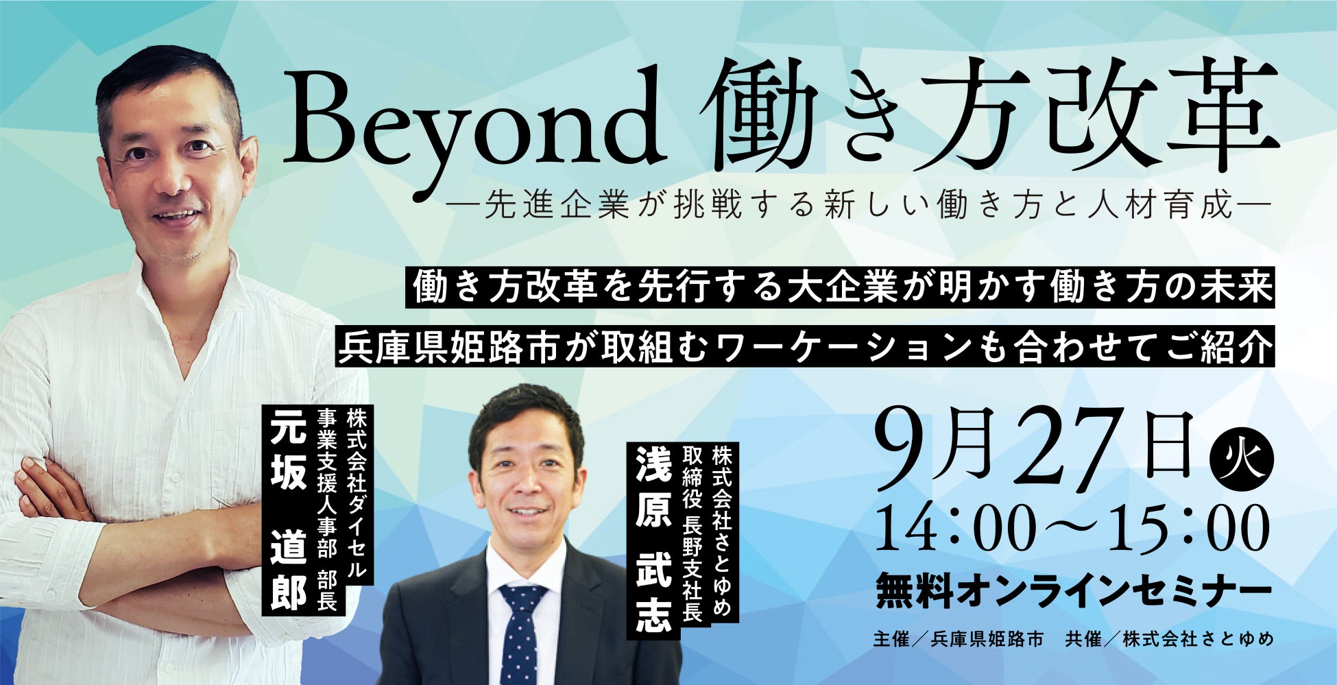 開催にあたり、積極的な働き方改革や人材育成に取り組んでおり健康経営優良法人(大企業部門「ホワイト500」)に2019年より3年連続で選ばれているダイセルより、元坂道郎様をお呼びして、同社の働き改革や人材育成方針についてお話頂きます。また、姫路市とさとゆめが実施した働き方改革や健康経営に関しての企業アンケートの結果、そして企業の課題解決への貢献を目指す姫路市のワーケーションについてご紹介させて頂きます。