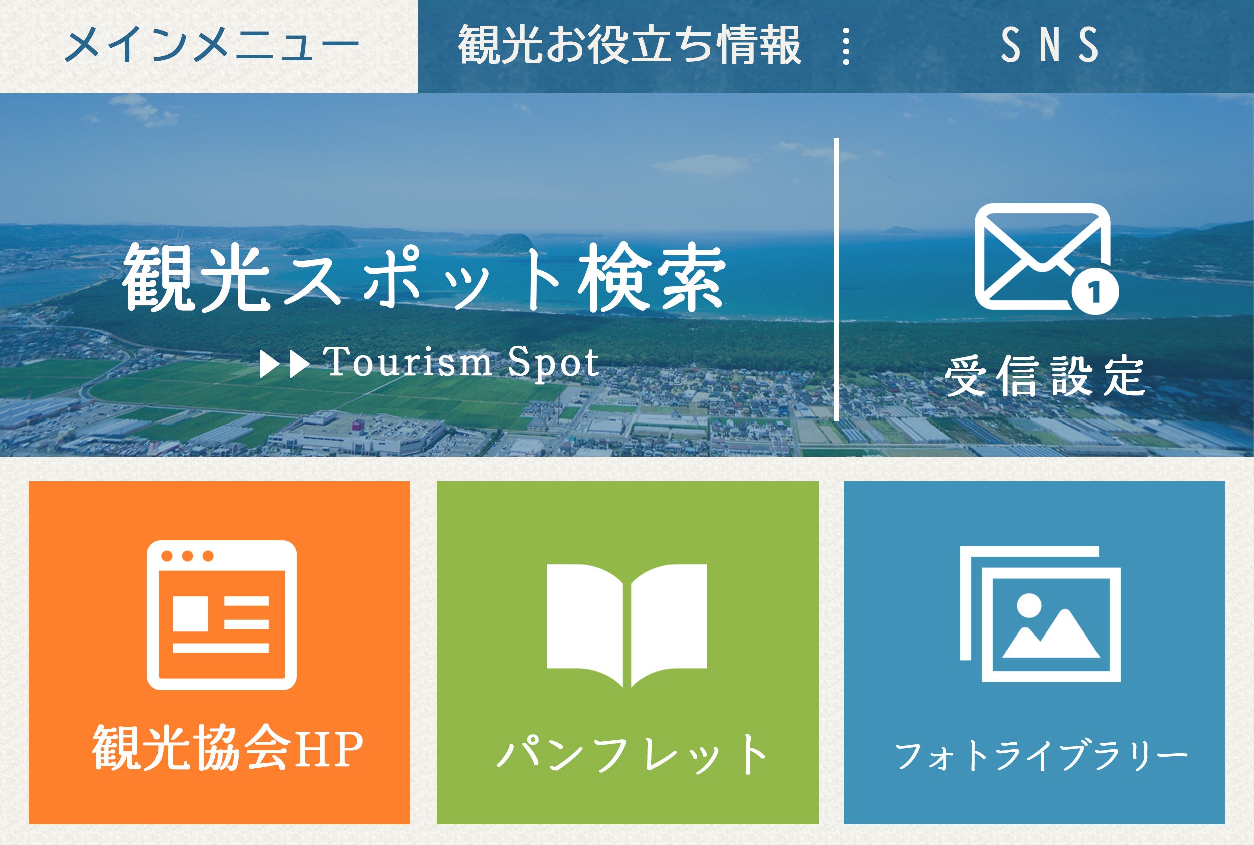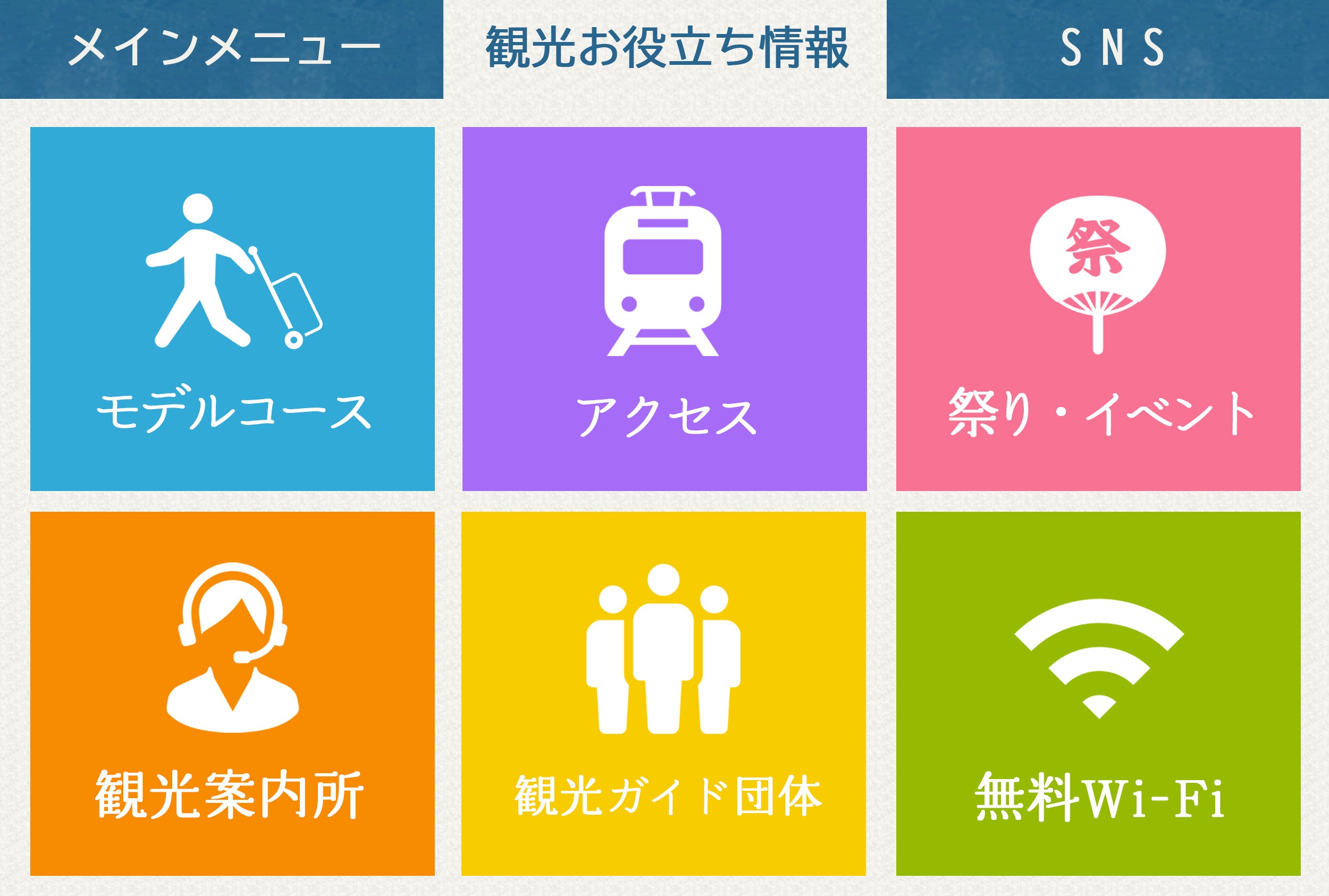 HPとも連携し、モデルコースのご案内や祭り・イベント情報、無料Wi-Fiなどもご案内しています。