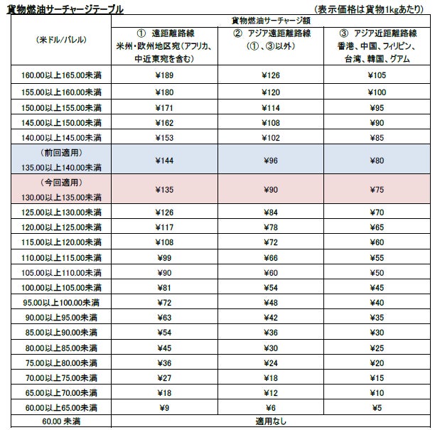 JALは日本発国際貨物燃油サーチャージの改定時期を年12回(毎月)としており、また、各月の貨物燃油サーチャージ額は「シンガポールで取り引きされるジェット燃油(ケロシン)価格の前々月の平均値」を燃油指標価格として、2022年4月より導入した以下テーブルに従いサーチャージ額を決定します。