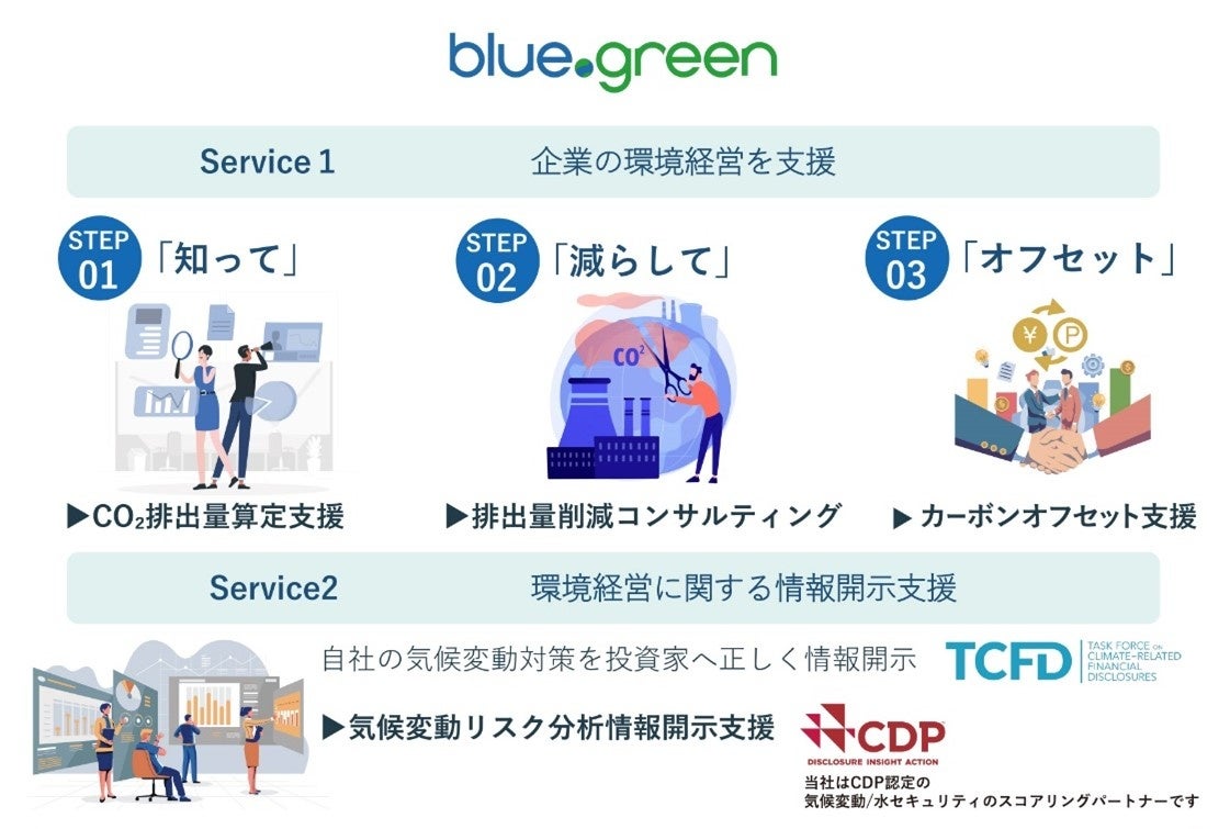 ブルードットグリーンではカーボンニュートラルを目指す企業のパートナーとして環境経営への取り組みをトータルでサポートしており、上場企業に求められるTCFDに基づいた気候関連財務情報(リスク・機会分析やCO₂排出量の指標等)の開示やCDP気候変動質問書への回答、また、LCA(ライフサイクルアセスメント)及びCFP(カーボンフットプリント)算定など、環境情報の開示支援を行っております。