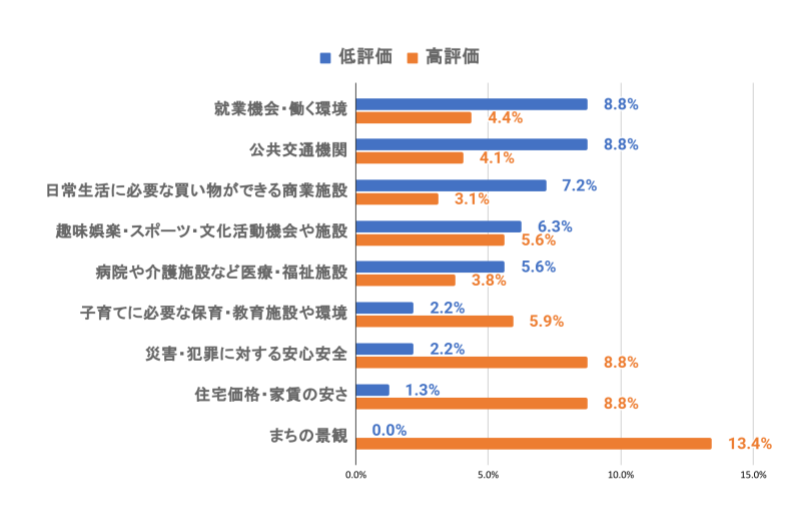 「条件次第ではまた住みたい」と回答した転出者の「まちの評価」項目別に比較してみました。課題が鮮明になるように、5段階評価の平均「3」を除外し、1〜2を低評価、4〜5を高評価として検証。「就業機会・働く環境」と「公共交通機関」の低評価の割合が最も高いことが分かります。将来的な移住施策として、この2項目が最優先テーマであると推察できます。
