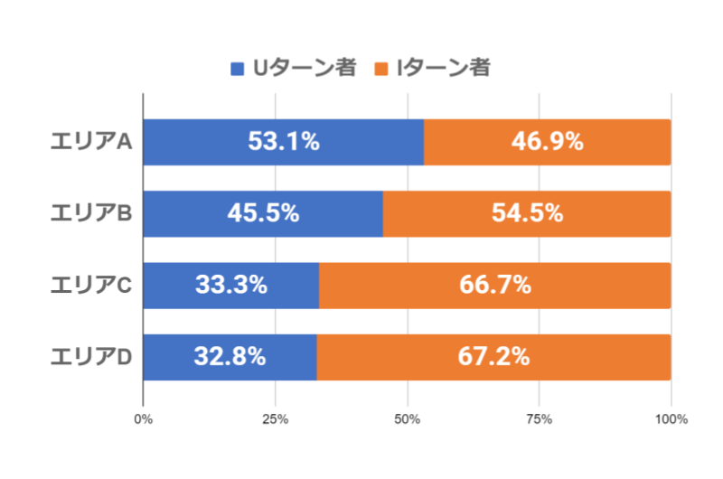 遠方からの転入者の「仕事環境の変化」が顕著な移住理由からも分かるように、実際に遠方のエリアDやCからの転入者はIターン移住がUターン移住より2倍多いことが確認できます。