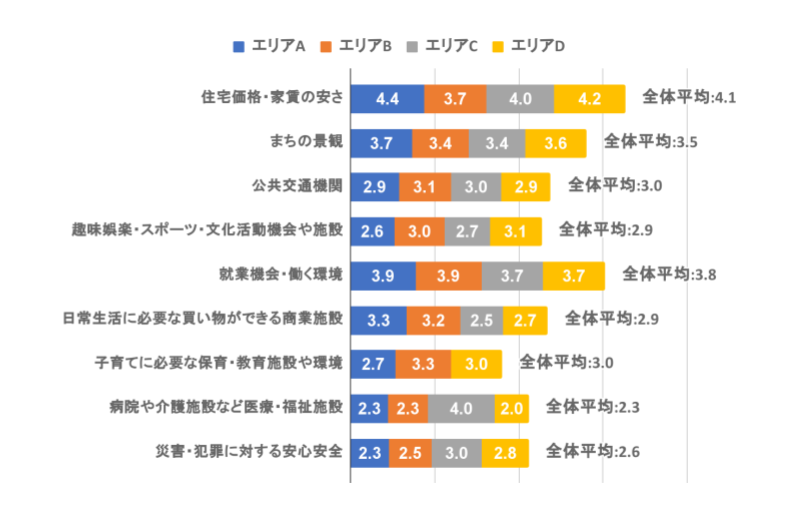 転入転出アンケートでは、「まちの評価」も集計しています。転入者の自治体評価は「住宅価格・家賃の安さ」が平均4.1(5段階評価)で最も高く、エリア別ではAからの転入者が4.4(同)とトップでした。一方で、「病院や介護施設など医療・福祉施設」の転入者評価は平均2.3(同)で全項目の中でも最低基準だったことから、医療・福祉施設の充実が喫緊の課題とも推測できます。