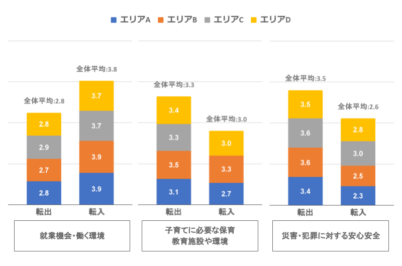 一方、転入者には高評価でも、転出者には低評価なのが「就業機会・働く環境」。エリア別に見ても、A〜Dの全ての地域で評価が下がっています。転入転出理由のトップが「仕事環境の変化」でしたが、自治体における就業機会の評価の改善が、今後の移住定住の成果に繋がるはずです。